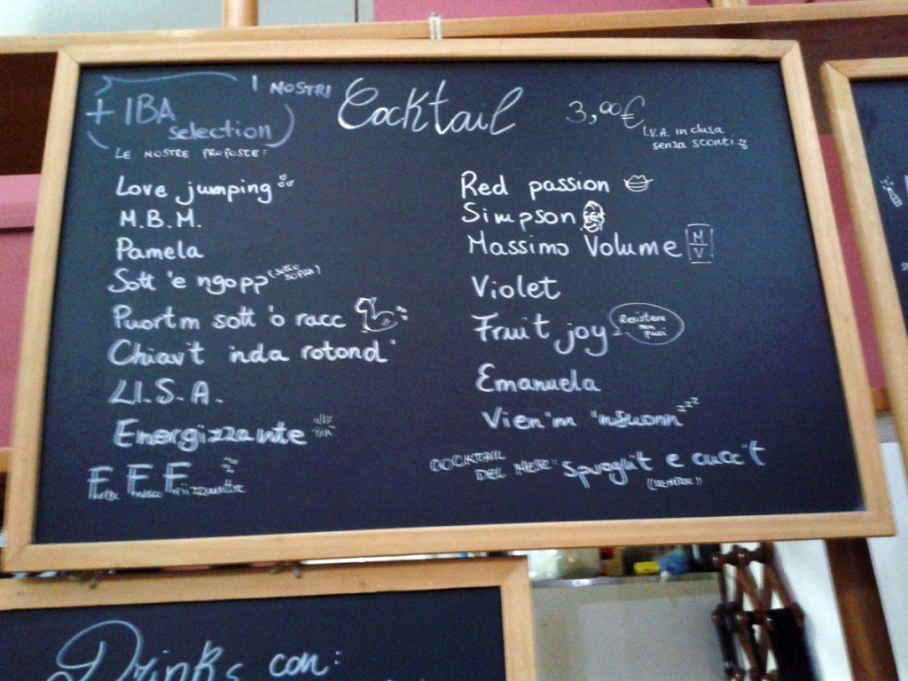 Il bar dello zio Frankie era davvero un unicum tra i bar e i pub che ho frequentato. Prezzi popolari, ma soprattutto memorabili i suoi cocktail: oltre al più famoso “Spuoglit e cucc’t” (Spogliati e va a dormire) c’era il “Chiav’t inda rotond” (Sbatti nella rotonda), “Sott ‘e ncopp” (Sottosopra) e molti altri, tutti di sua invenzione. Non potevi trovarli letteralmente in nessun altro posto al mondo.