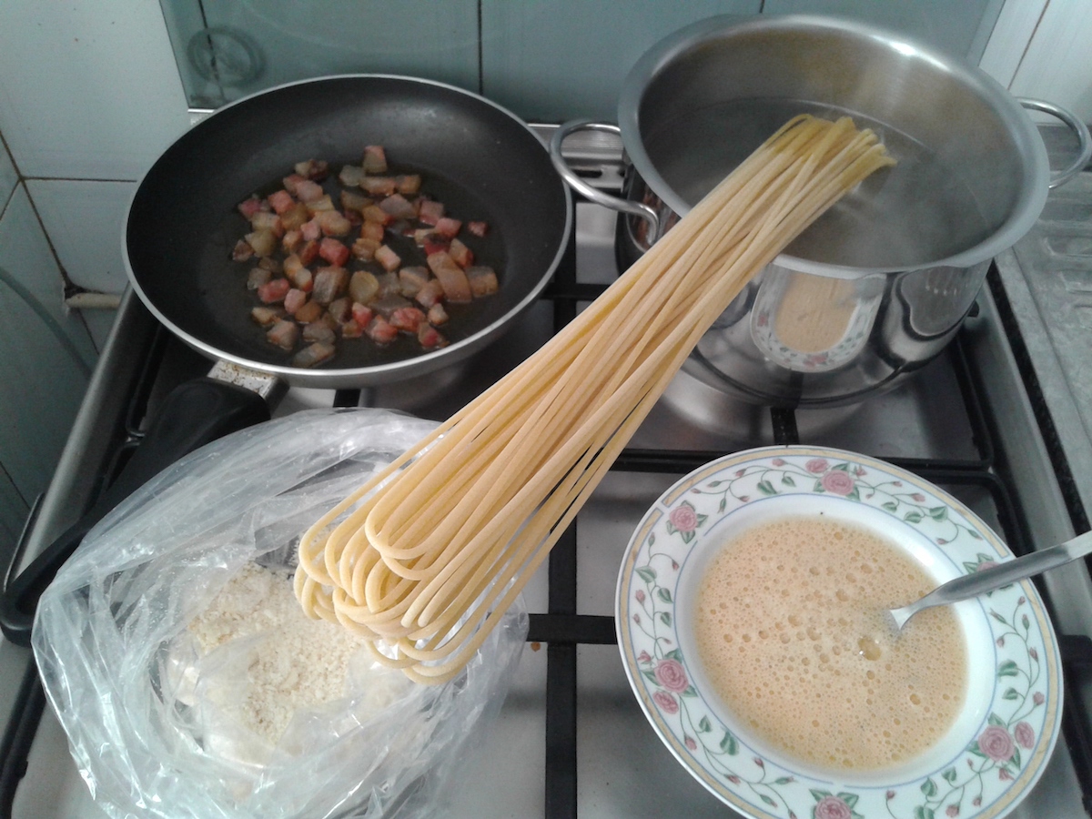 Dato che io uso, quando li trovo, gli spaghettoni, impiegano così tanto a cuocersi che per prima cosa metto l’acqua sul fuoco e, a ebollizione, calo gli spaghettoni e il sale. Quindi questa prima parte dipende dagli spaghetti che utilizzate e dal tempo di cottura.