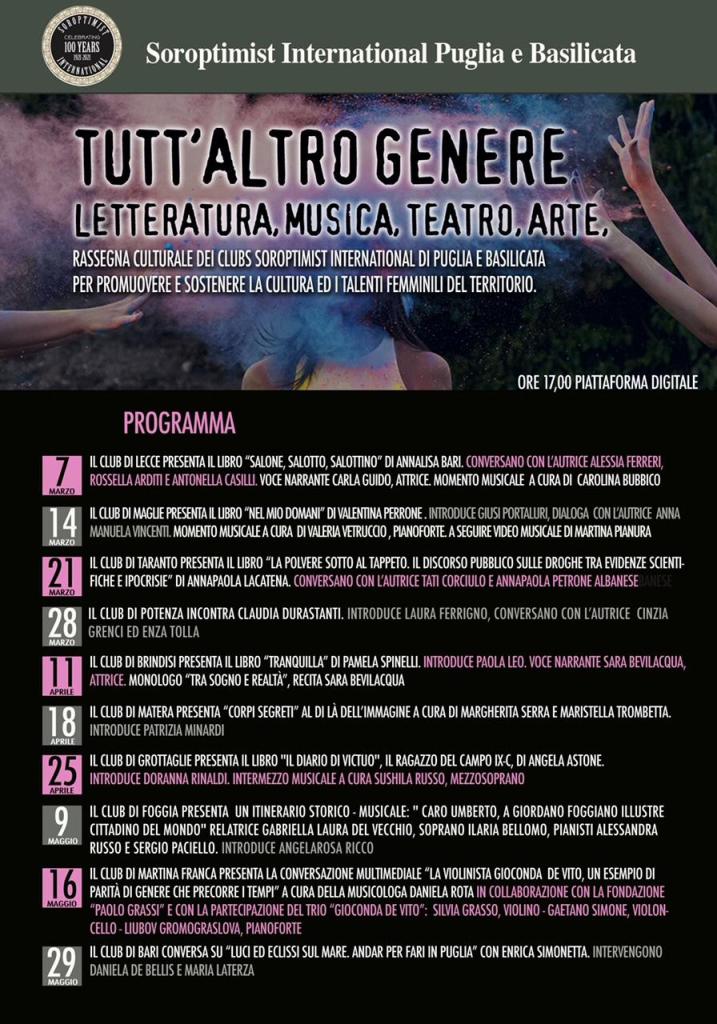 Non mancano iniziative volte a sensibilizzare l’opinione comune. Ad esempio, la Soroptimist International, di cui quest’anno si celebra il centenario della fondazione, che vanta ormai 158 club in Italia. Il più giovane ma già molto attivo è quello di Maglie Sud Salento, nato appena prima dell’esplosione di coronavirus ma nonostante tutto mai fermo. Soroptimist per definizione promuove e sostiene la cultura e i talenti femminili del territorio, a volte attraverso l’unione di più club. È il caso dei club Soroptimist Puglia e Basilicata, che insieme hanno dato vita a Tutt’altro genere – Letteratura, musica, teatro, arte.